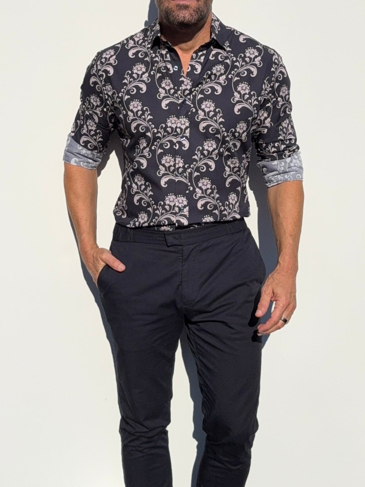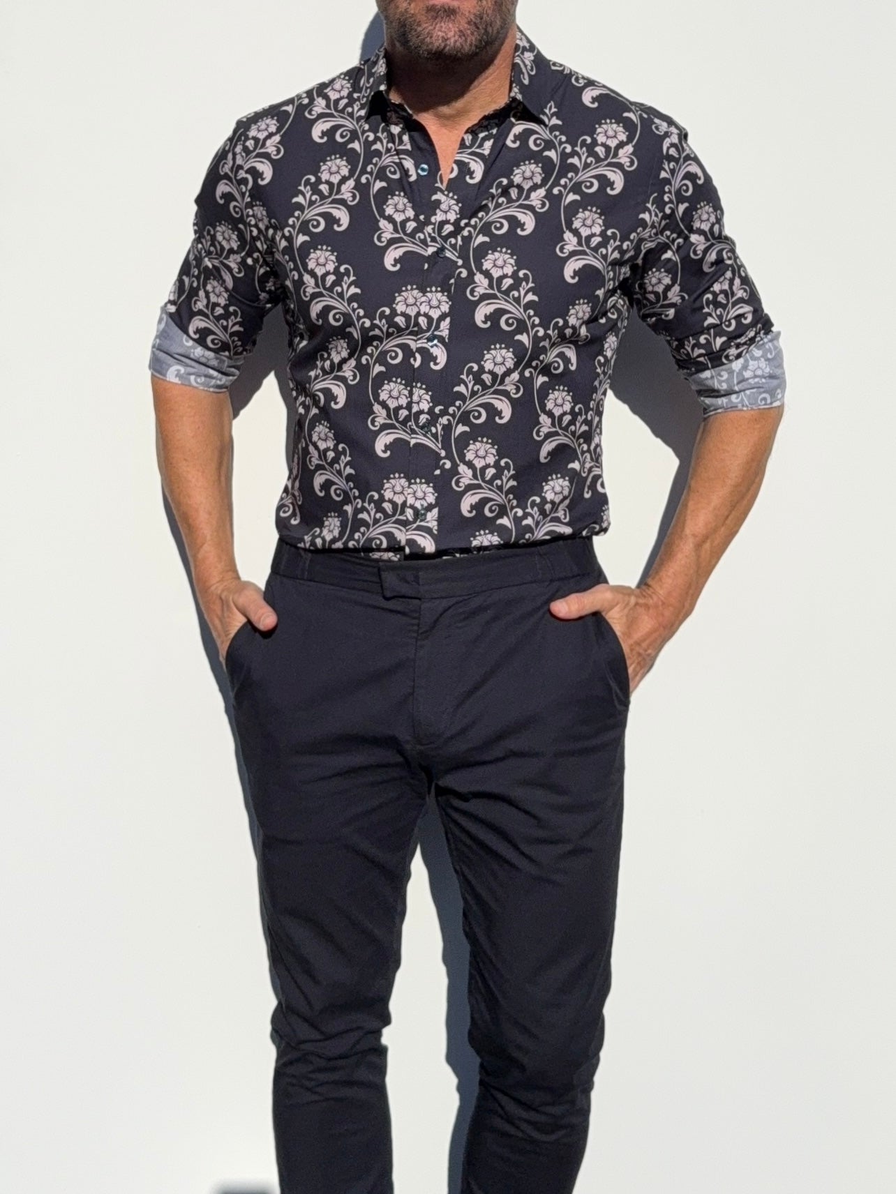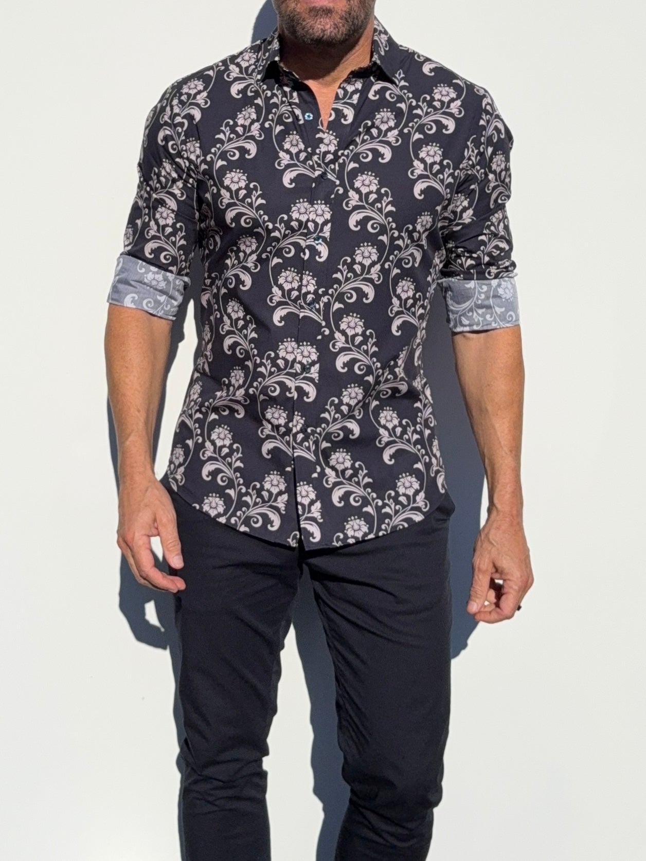 Our shirts taper toward the midsection and fit close to the body.