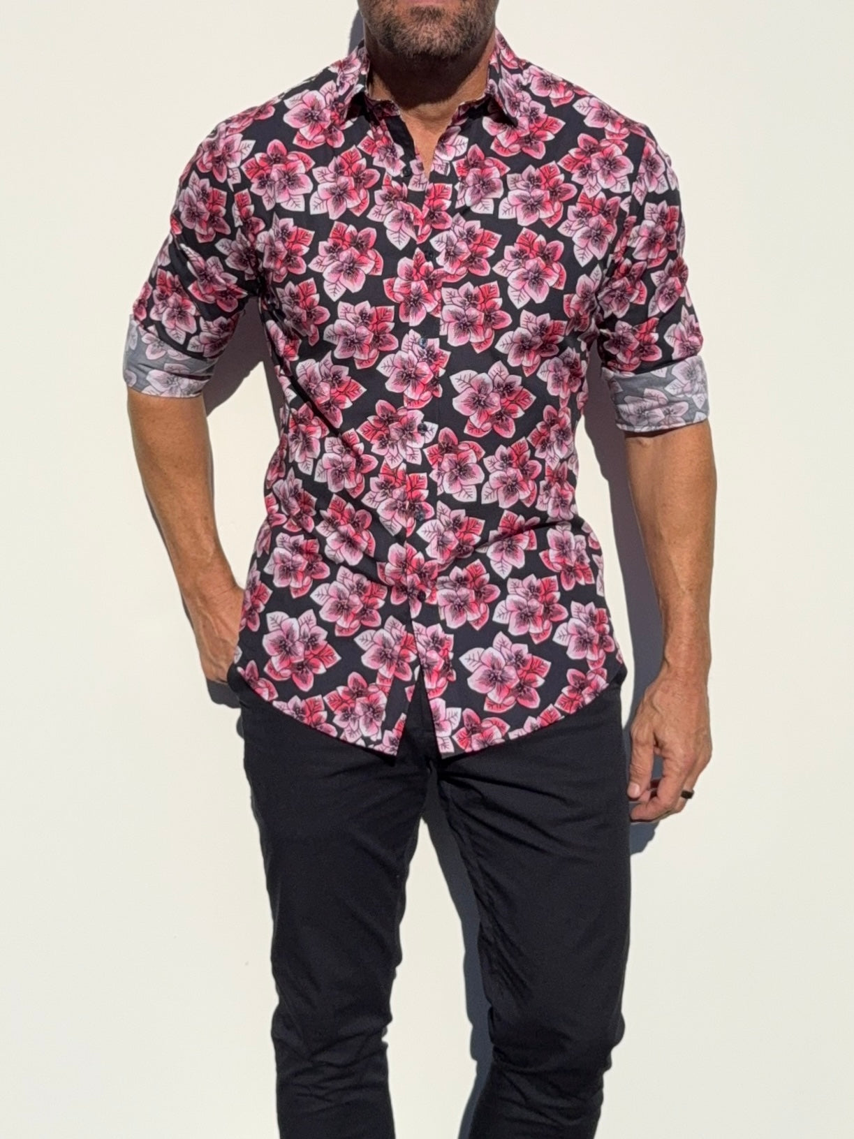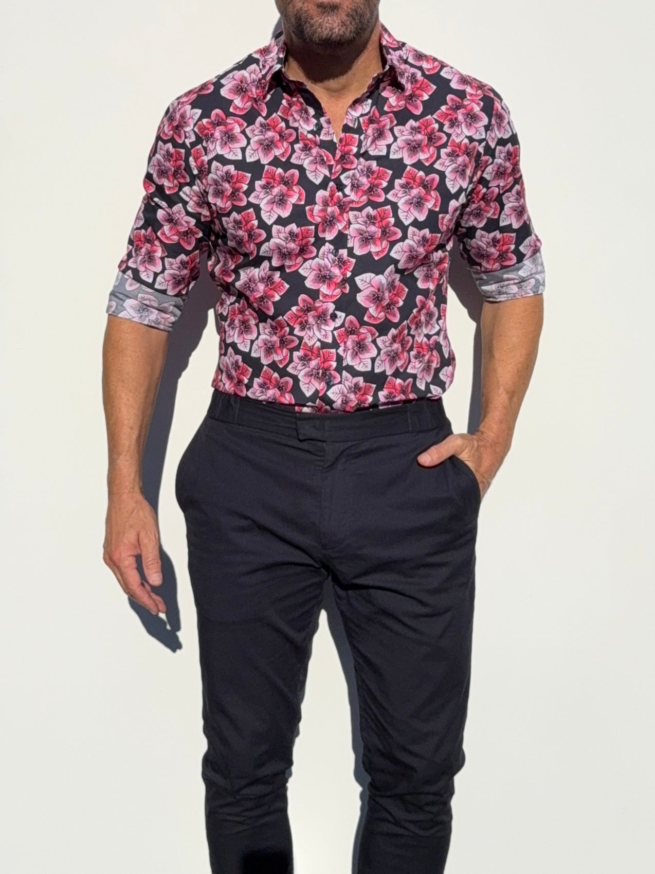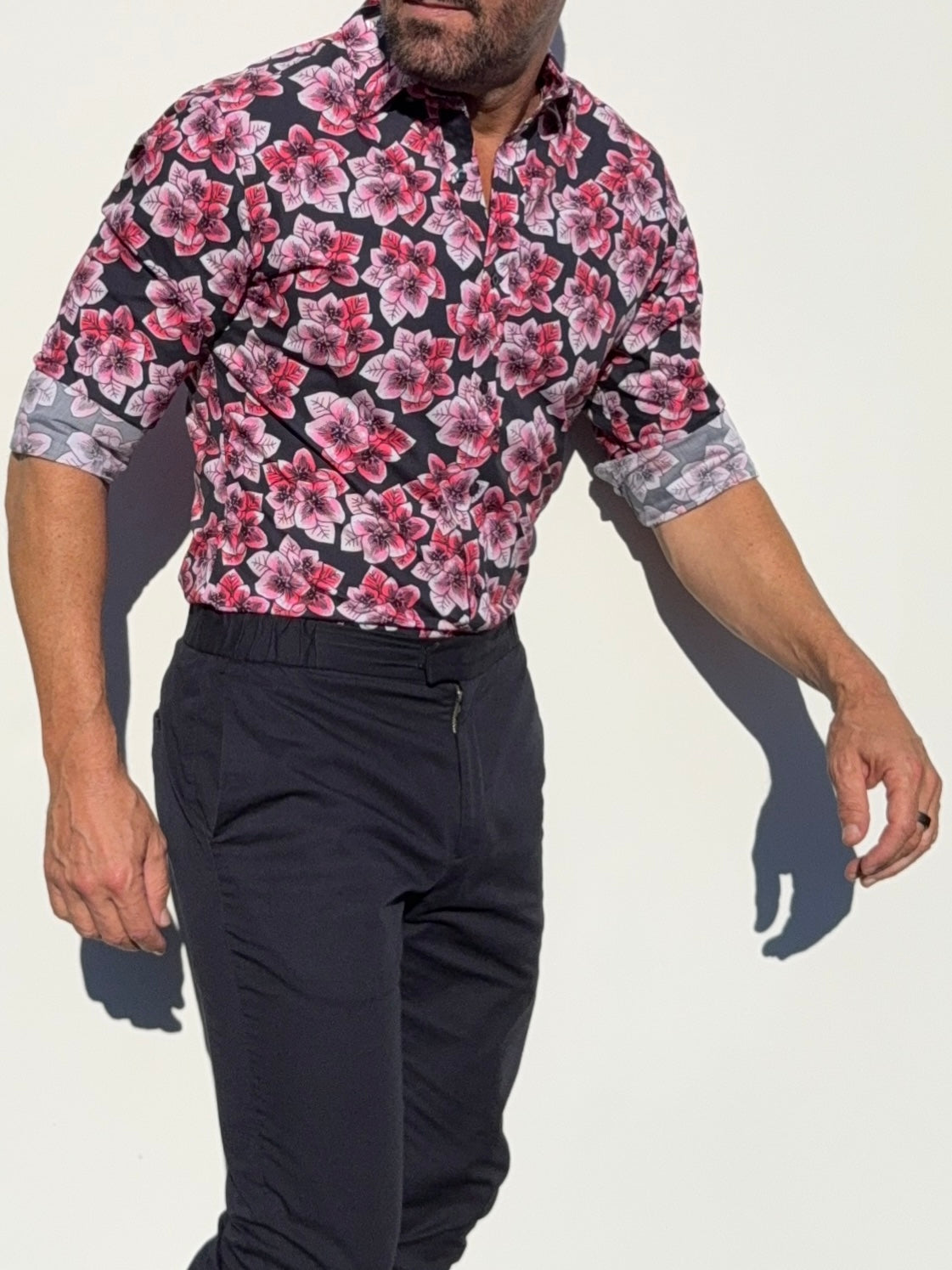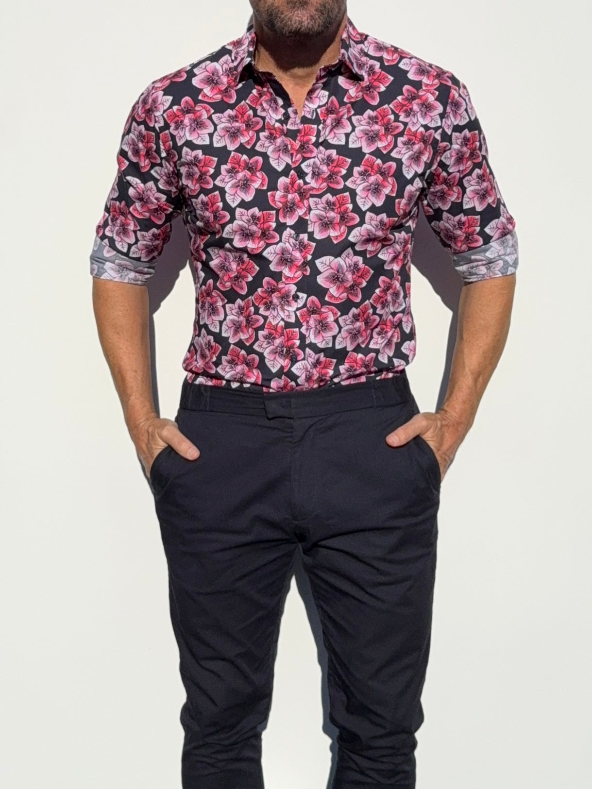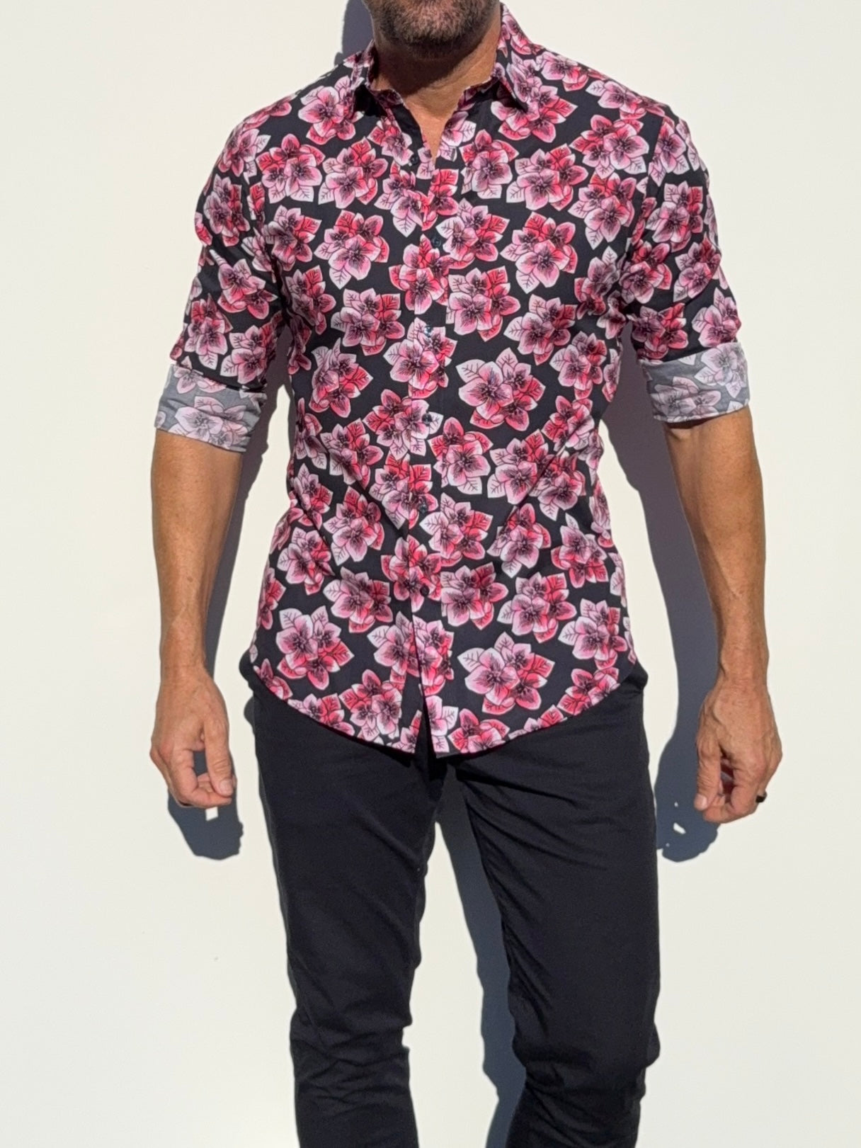 Our shirts taper toward the midsection and fit close to the body.