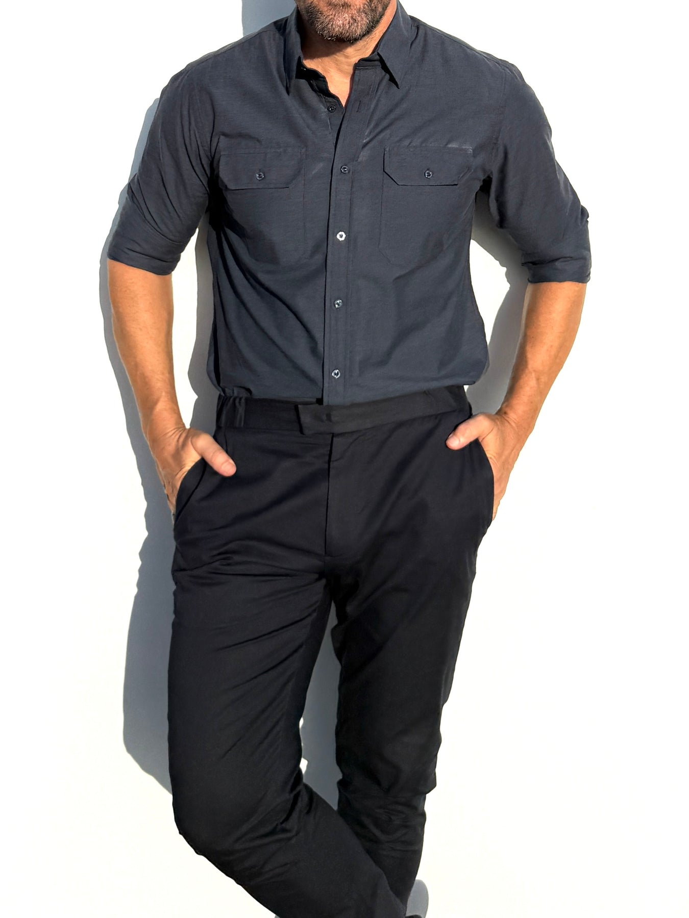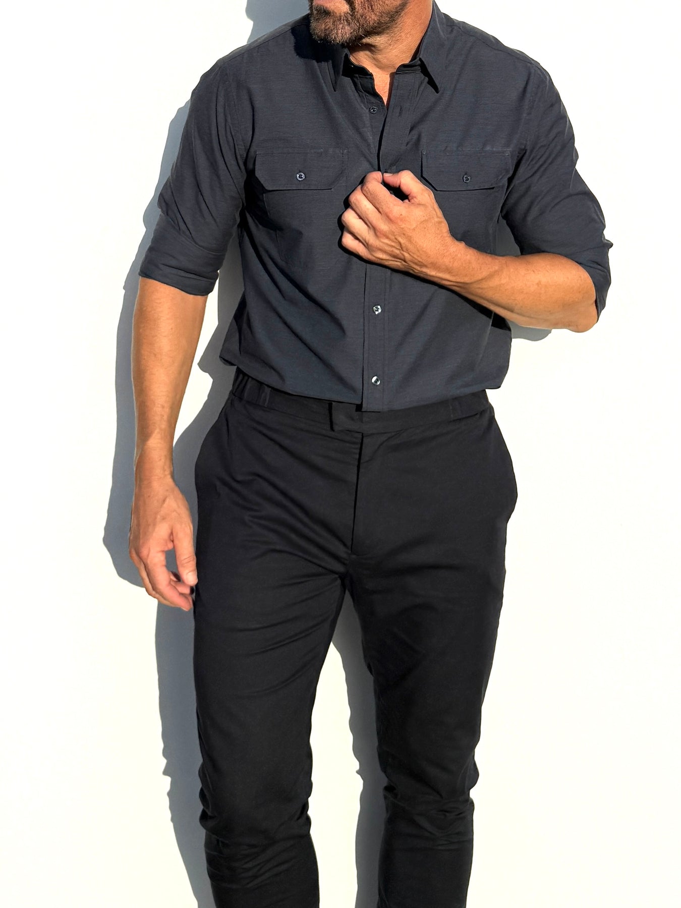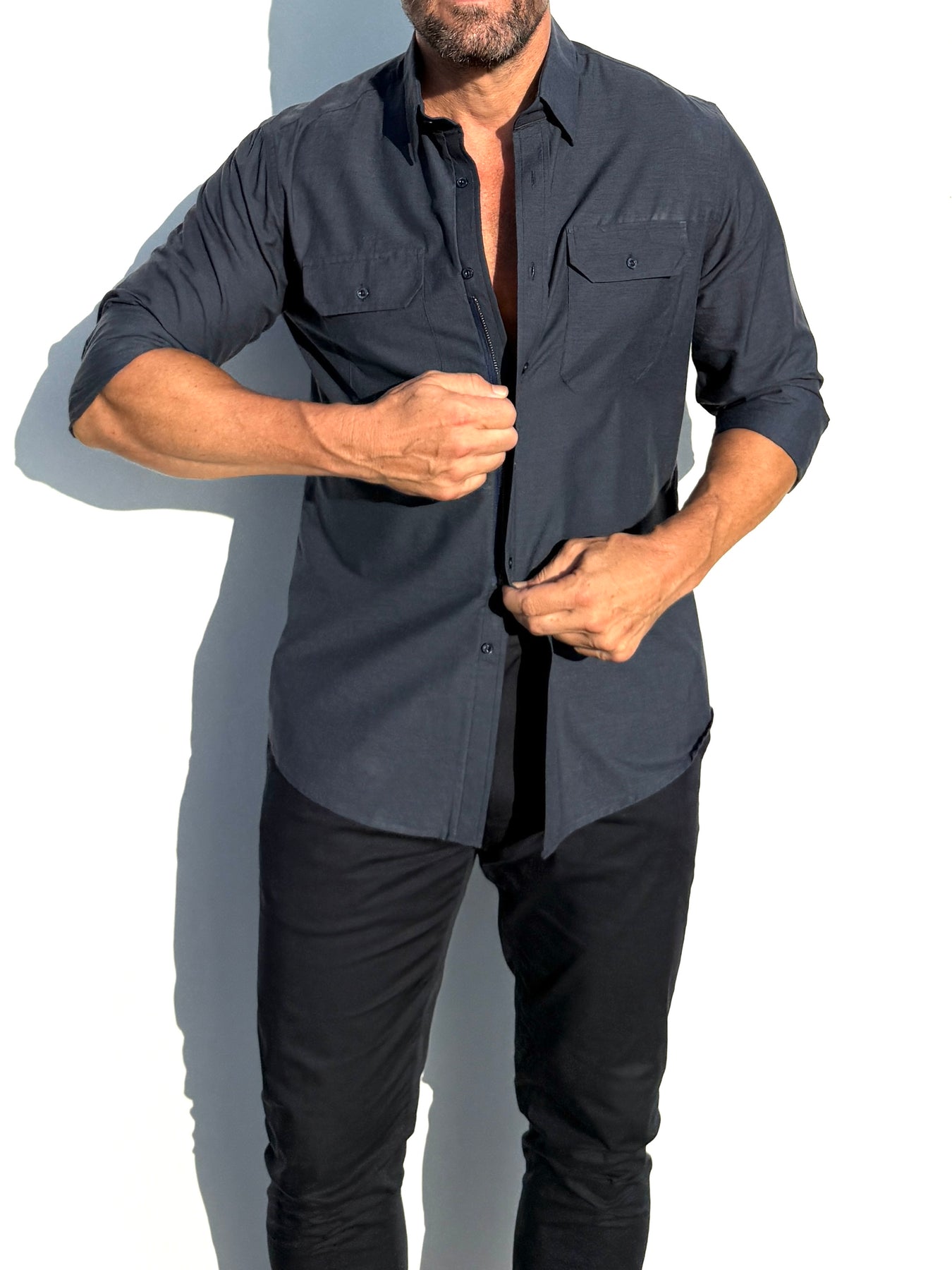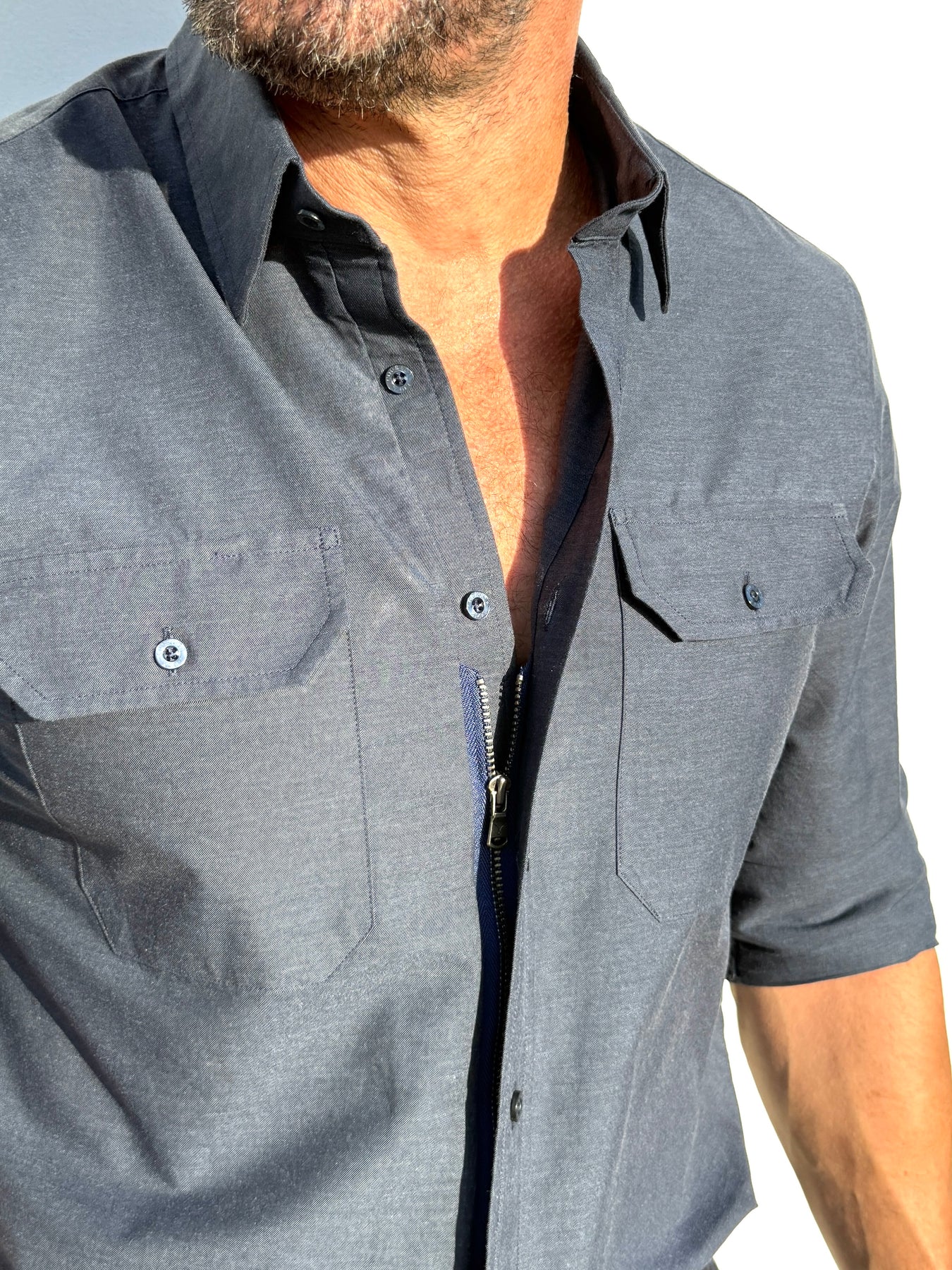 We studied the archetypal male form to find the ideal ratio between shoulders, chest, waist and hips and built our shirt around it. The zipper evenly distributes any tension and allows you to wear a closer fitting shirt, without looking like you're busting out of it.